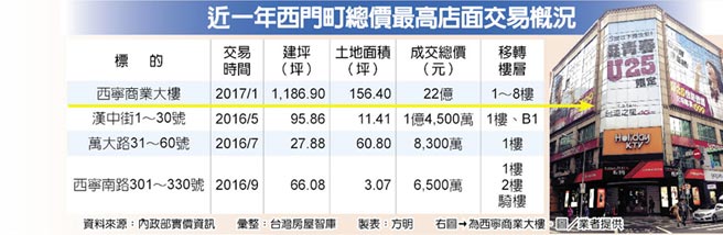 另外,全銓2016年3月才以3億出售同樣位在西門町的漢中街2層樓透天店面,土地坪數11.5坪、建坪41.33坪,當時該筆交易不僅創西門町透天店面總價交易新高,換算成地坪單價超過2,000萬元,也刷新單價紀錄,據了解該筆交易買方也是吳振隆。